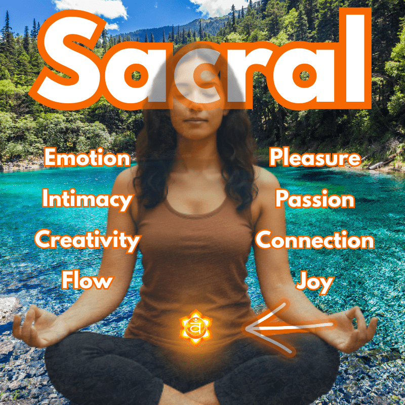 The sacral chakra is the second chakra in the chakra system, sitting just above the root chakra in the lower belly area — around your womb space, pelvis, and hips.